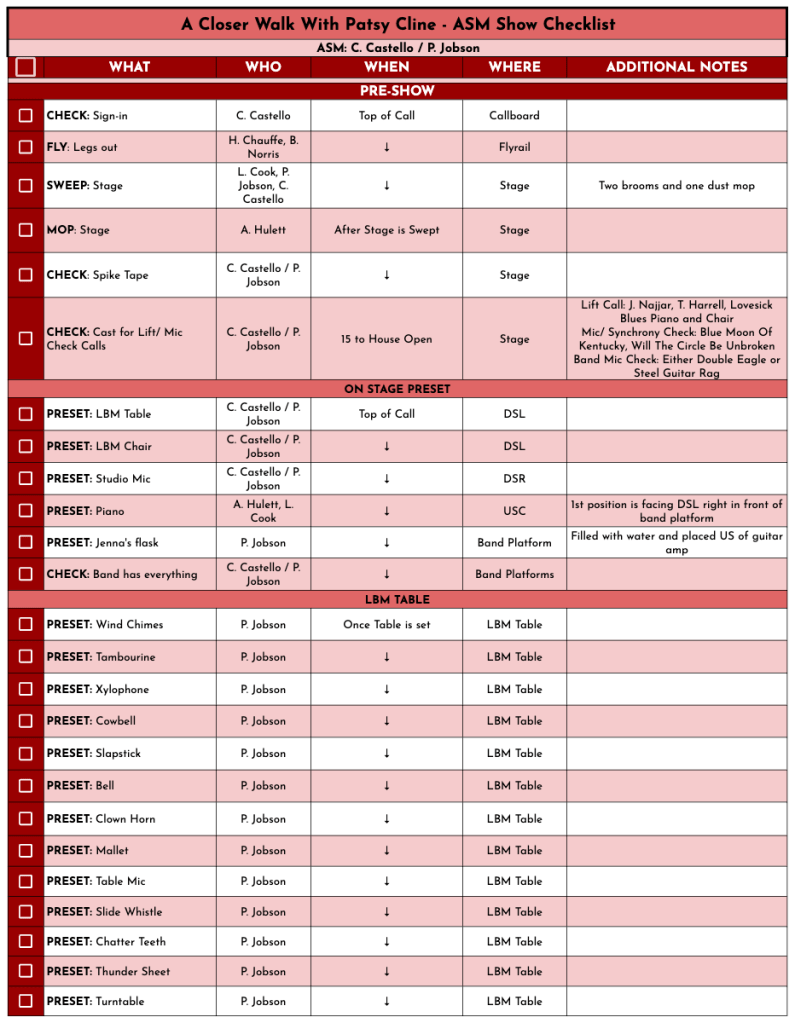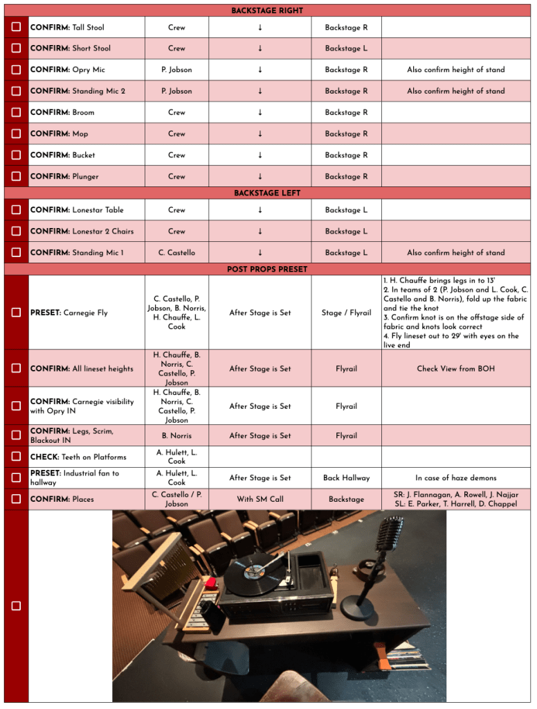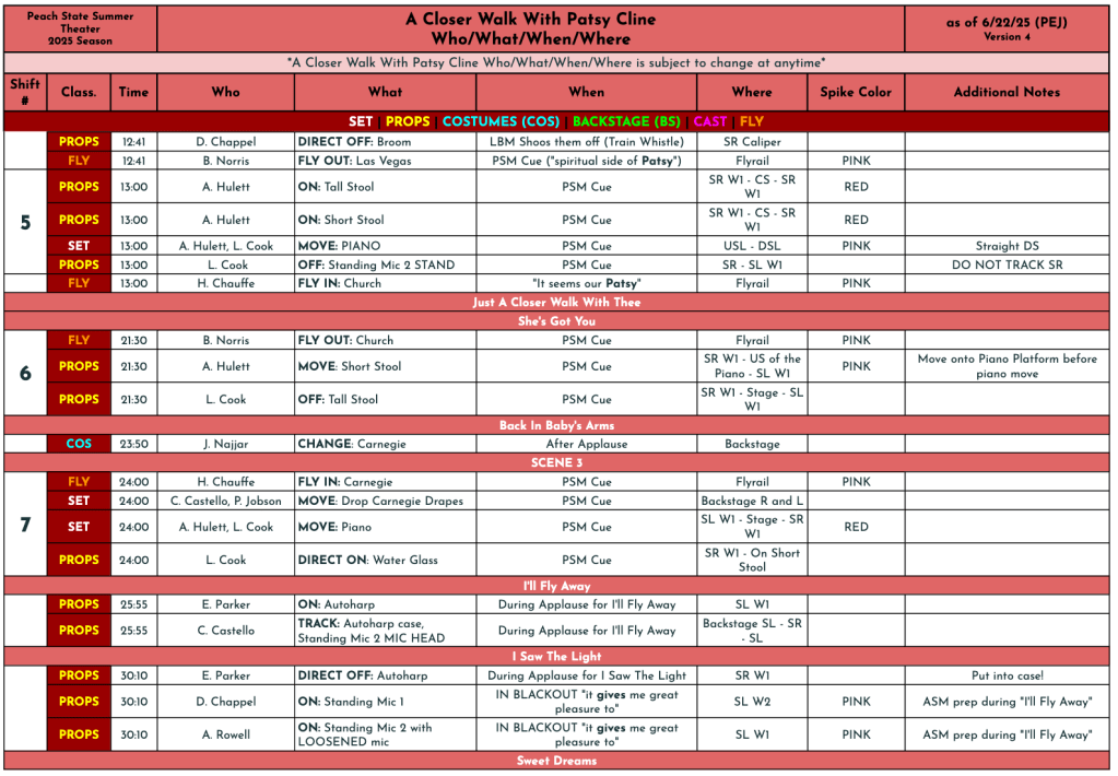 While it was a notably smaller show than the other two we produced this season, it was not boring. We had many flyrail elements which needed to time out very specifically for safety. The band was also onstage, and I cued two costumed crew members multiple times to move the piano’s position.