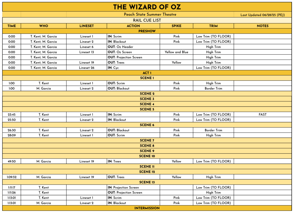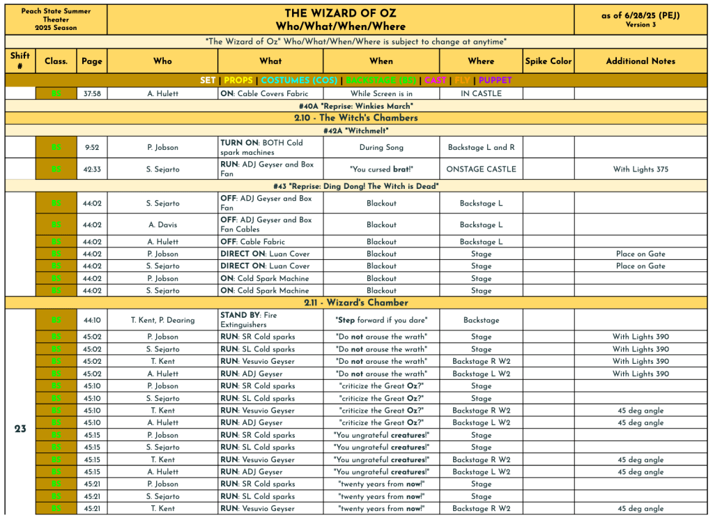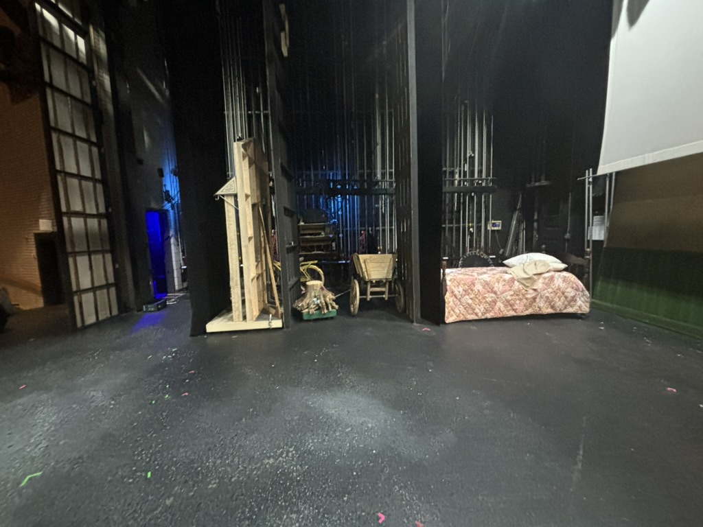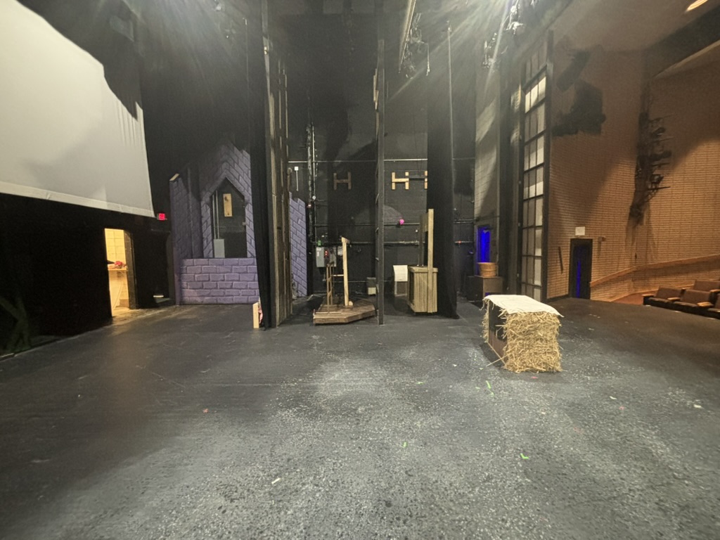This show had by far the most scenic elements of our season, including the witch’s castle, which required 3 people to move, and its corresponding staircases, which used an additional 2 total. The witch’s castle had a trapdoor utilized for the melting sequence, which was operated by 2 crew members, with the deck electrician manning the fog machine. Much of my challenge for this production was making sure that each transition could physically happen. Dealing with caveats such as both automated and hemp linesets, each of which were only allowed to be operated by specific crew members, meant that I had to think outside of the box for many of our transitions in order to keep them fast and clean.